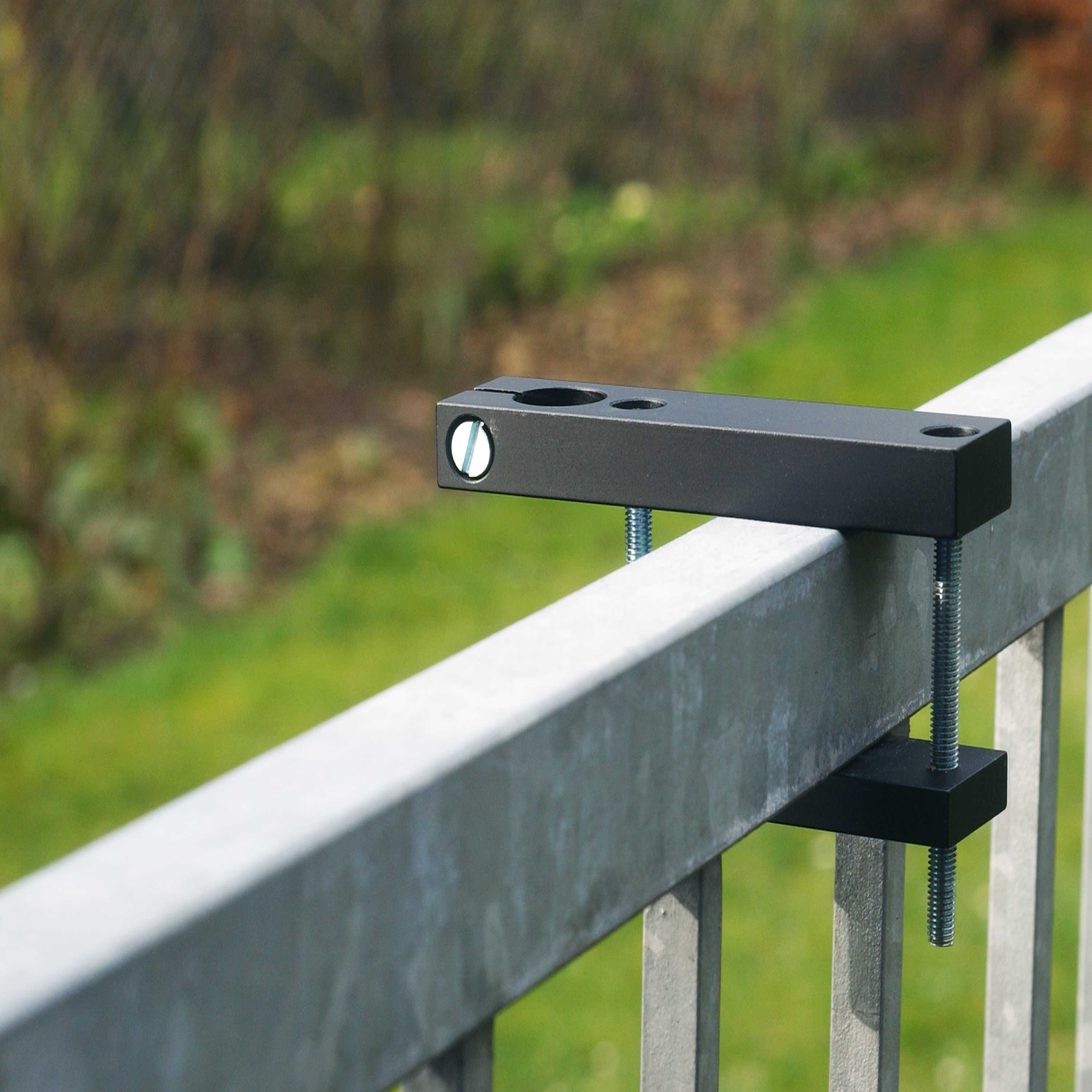Auf den meisten Balkonen darf leider nicht gebohrt werden, so das unsere Wandhalterungen nicht verwendet werden können. Mit dieser Teleskopstangenhalterung für eckige Balkon Handläufe lassen sich unsere Boy-Teleskopstangen, mit einem Durchmesser von 19mm, problemlos und dauerhaft befestigen.