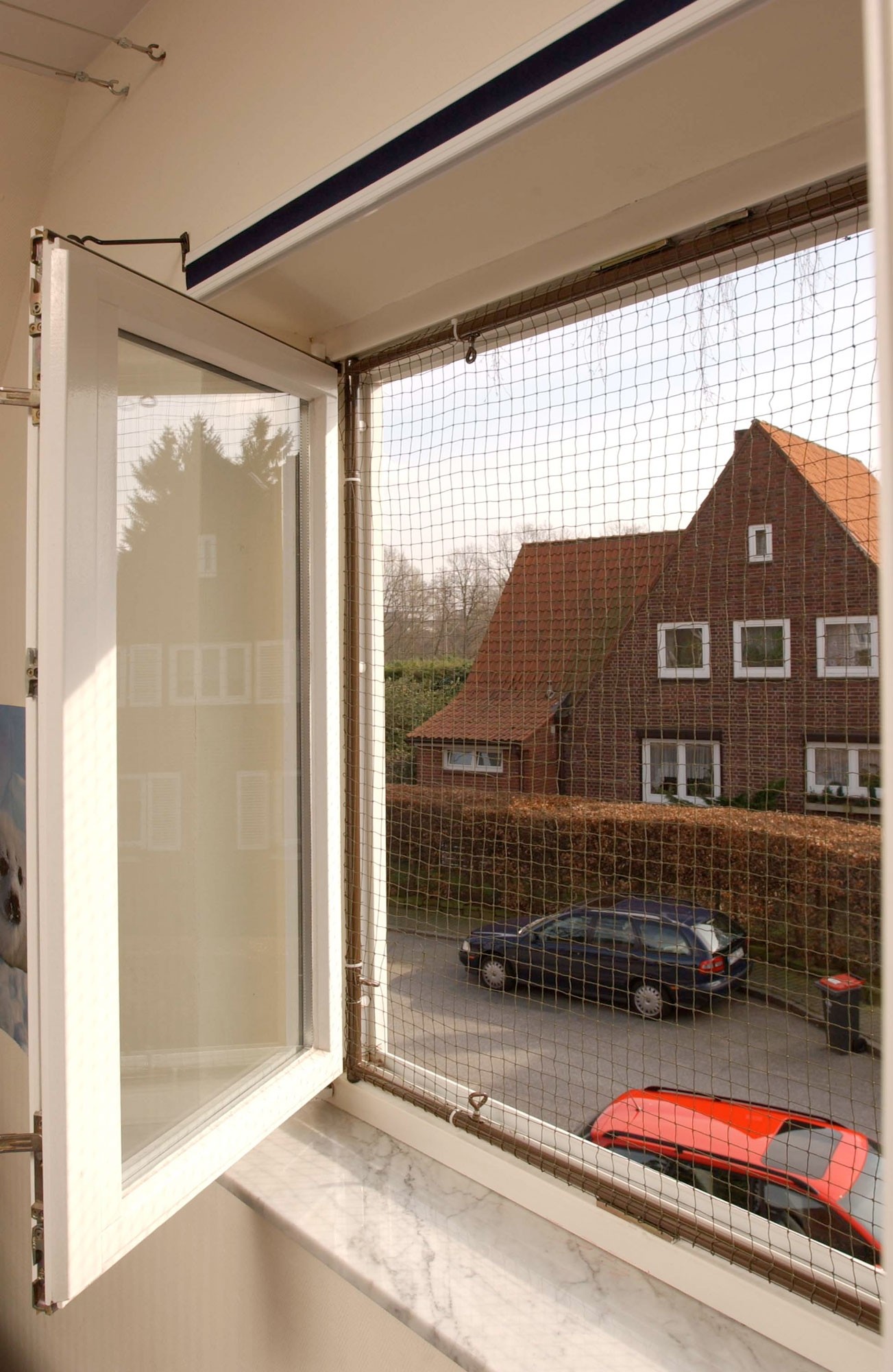 Optimal window protection for house cats. This cat window protection consists of a sturdy tubular steel net frame and a white Boy cat net with a mesh size of 20mm. The net frame is clamped into the groove of the open window frame.